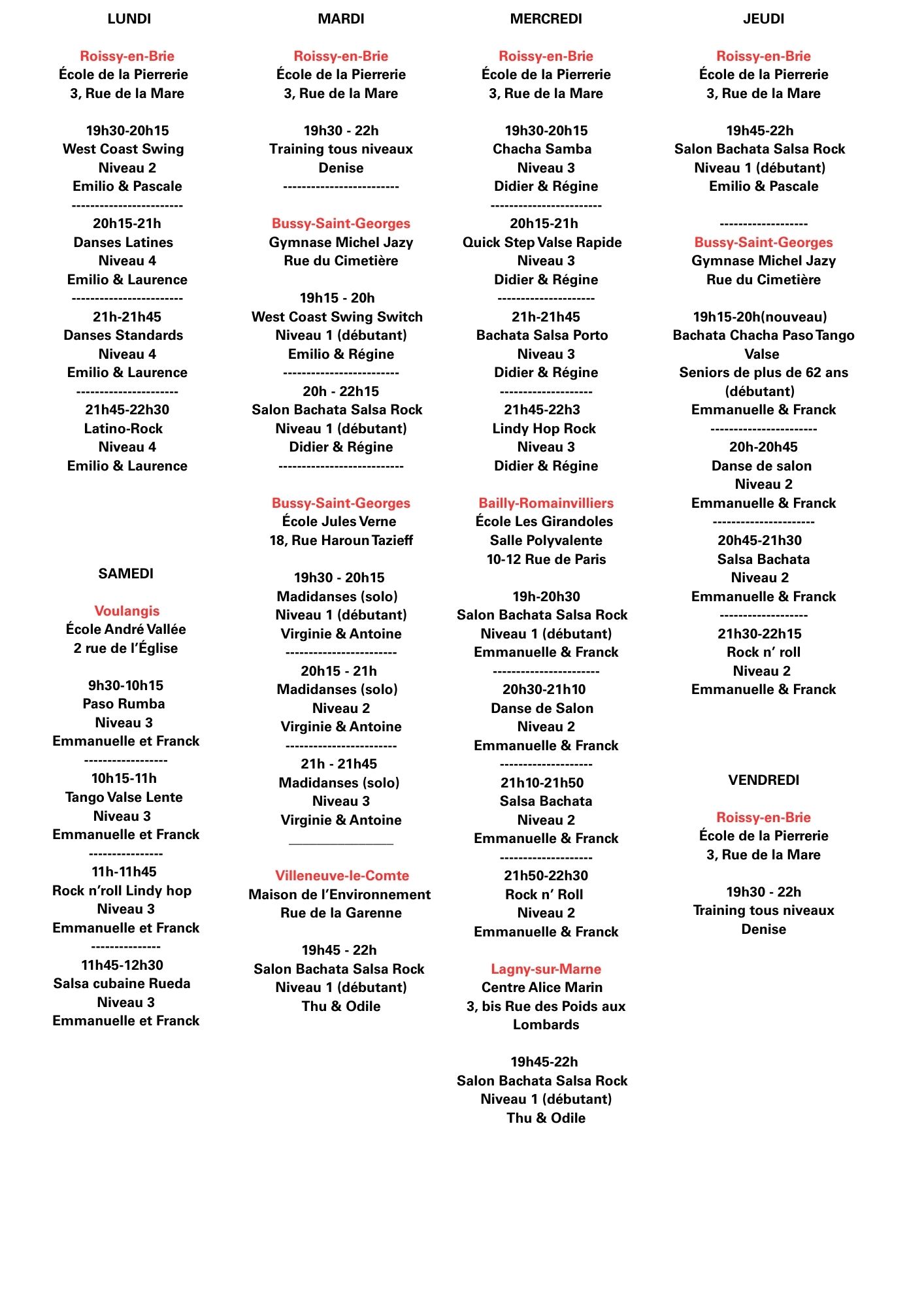– Les danses * à 4 Temps (Bachata – Chacha – Rumba – Tango – Quick step – Rock n’ roll – Lindy hop – West coast swing)