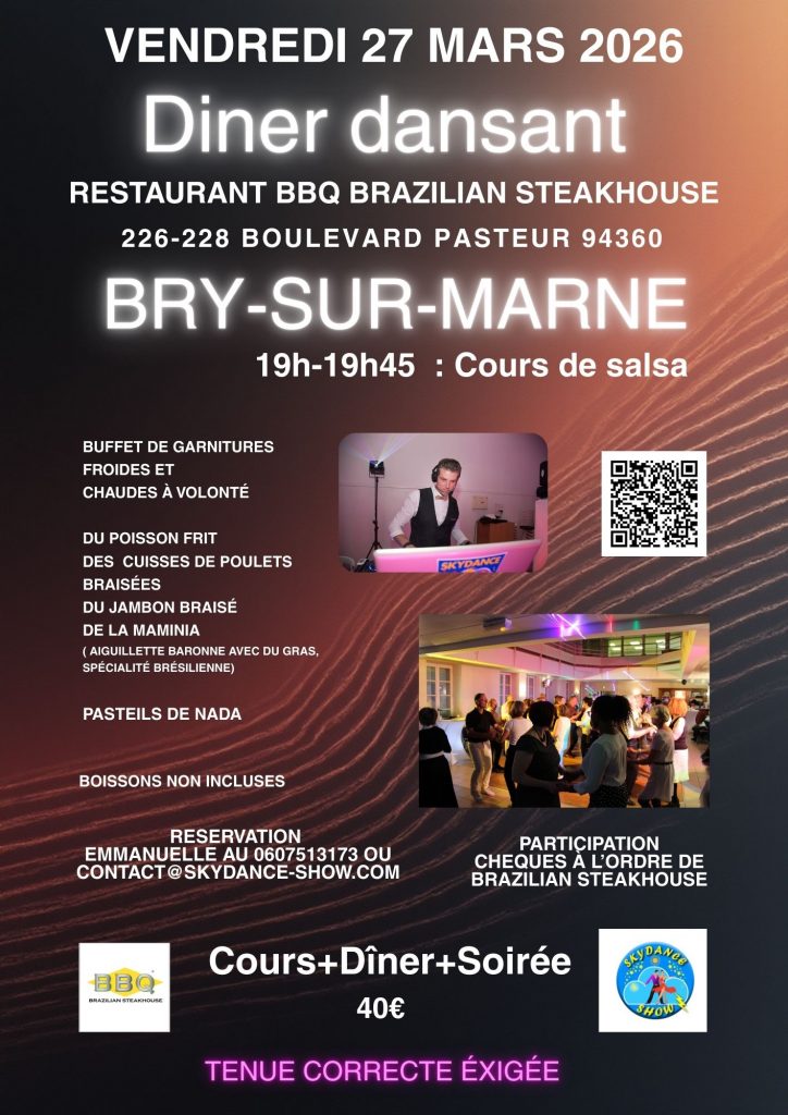 | Dîner dansant – Restaurant BBQ Brazilain Steakhouse | Vendredi 27 mars 2026 – Cours de Salsa à 19h | 19h-24h | 94360 Bry-sur-Marne | Emmnuelle 0607513173 |