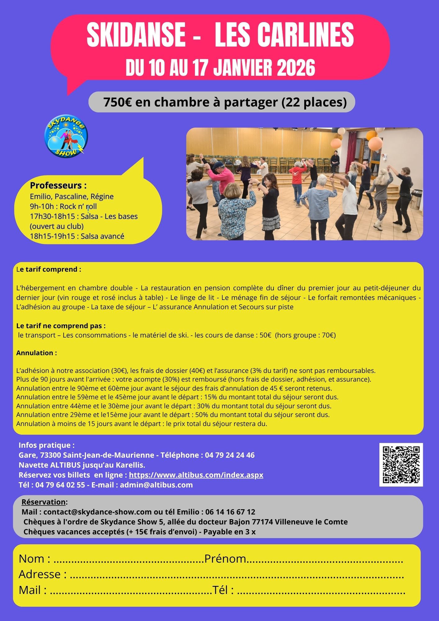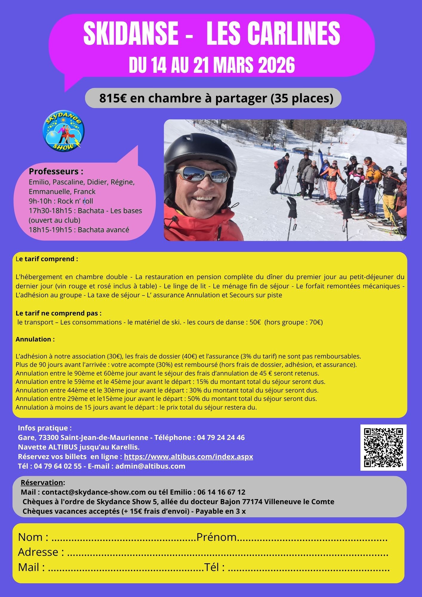 Tarif : 750€ en chambre à partager – Pension complète – Remontées mécaniques, taxe de séjour et Assurances incluses (COMPLET). Nous avons créé pour vous les vacances parfaites accompagnées de Pascaline, Régine et Emilio qui vous feront danser le Rock n’ roll et la Salsa ou la Bachata entre deux pistes. 14h de cours !