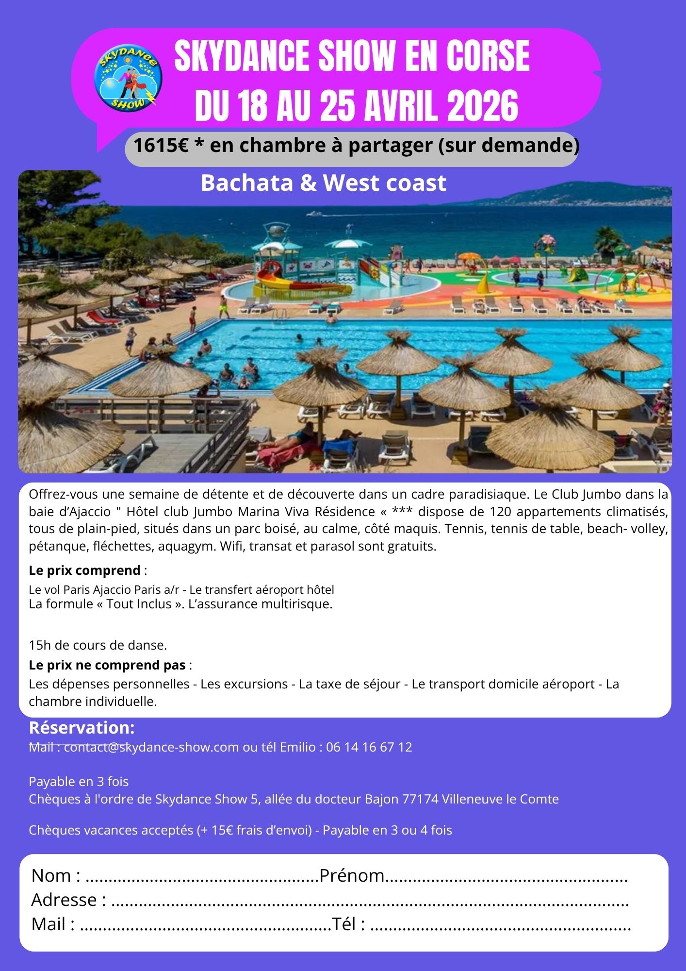 1615€ en chambre à partager TOUT COMPRIS 15h de Bachata et West coast et +